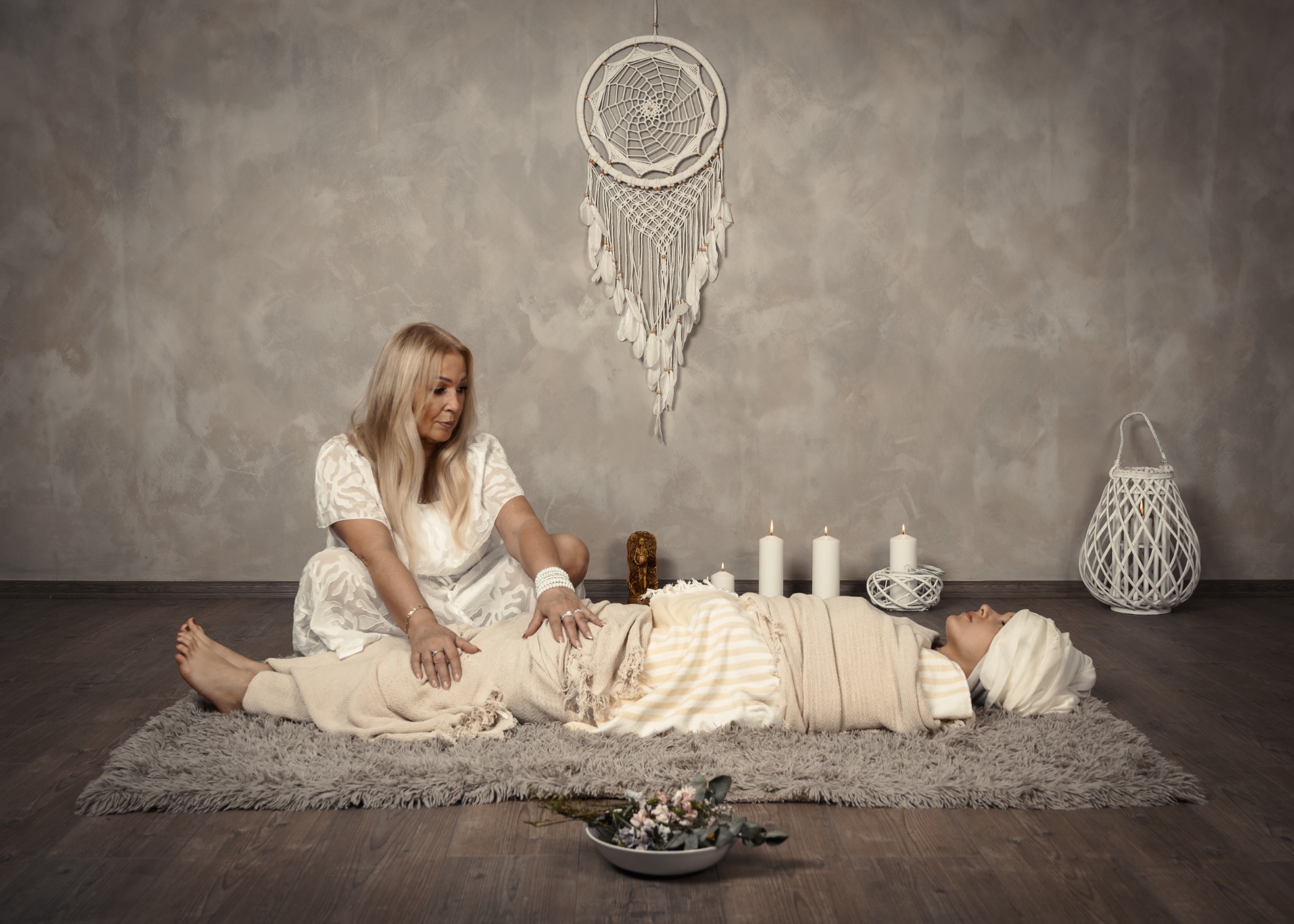 Součástí bývá jemná práce s tělem, klidné prostředí a postupné zavinutí do šátků, které přináší pocit bezpečí, opory a hlubokého uvolnění.